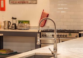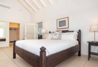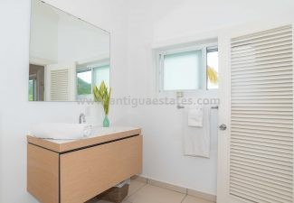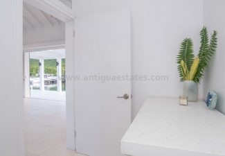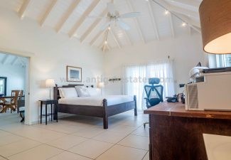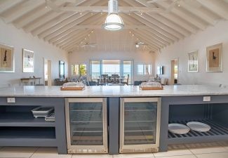 As you enter the grand foyer through the large French doors you’ll be greeted by stylish dĂ©cor and high vaulted ceilings lined with LED lights. A spacious open concept kitchen with large marble countertops and contemporary grey cabinets serves as the heart of the villa. A larder and prep room with plenty of storage space is just off the kitchen. The kitchen flows seamlessly into a comfortable lounge area, offering panoramic views of the 30ft pool and the Caribbean Sea with the islands of Redonda and Nevis visible in the distance on clear days, The layout gives the villa a light and airy feel allowing cooling breezes to flow through the house.