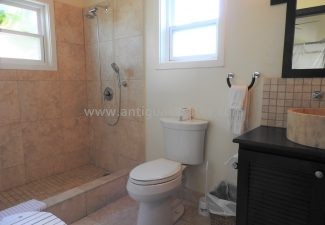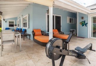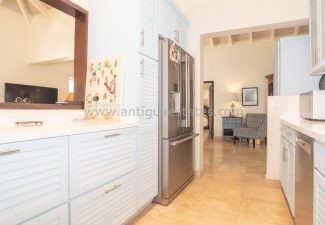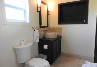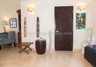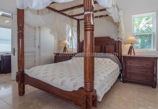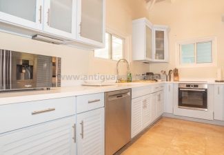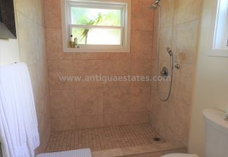 The dining area opens up through the armour mesh-protected glass sliding door onto the breakfast patio with cut stone flooring which flows from the inside out. The patio and the large sun deck offer not only an excellent harbour view but a beautiful backdrop of Antigua’s green hillsides.