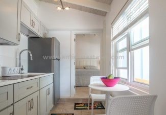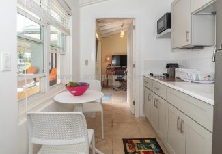 The interior of the main house impresses has an airy high ceiling and an open floor plan as well as a fully equipped, modern fitted kitchen which has new stainless steel fittings and appliances. This area is connected to an elegant dining area via a large serving window. There is one large bedroom with a grand four-poster bed and a separate room enclosed with large wooden double doors which is currently being used as an office, however this could easily be utilized as a bedroom if preferred. The en-suite bathroom is fitted with a shower as well as a large bath tub. The well-designed guest bathroom completes the main house and includes a stacked front-loading washer and dryer.